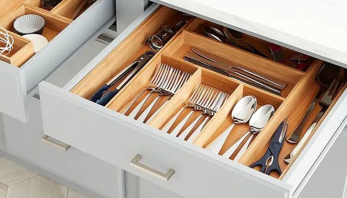 کارد و چنگال و ظروف کوچک آشپزخانه خود را با کمک جا قاشقی در کشوها قرار دهید. همچنین فضایی را برای وسایل آشپزی خود در نظر بگیرید و برای صرفه جویی در فضا آن ها را در سبد نظم دهنده قرار دهید.
