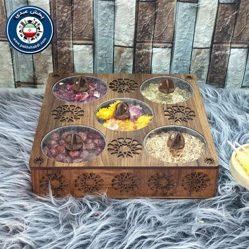 جعبه تی بگ 5 خانه مربع طرح دار از چوب زیبا و با کیفیت 3 میل ساخته شده است. این محصول به شکل مربع است و درون آن 5 خانه ی مجزا برای ریختن خوراکی وجود دارد. از دیگر ویژگی های این تی بگ این می باشد که هر محفظه ی آن درب جداگانه ای از جنس پلاستیک شفاف دارد و محتویات هر خانه از بیرون مشخص است و هر کدام را که دوست داشتید به وسیله ی دستگیره ی کوچک و فانتزی که روی آن قرار دارد باز می کنید. در ضمن توجه داشته باشید که یکی از خانه های آن مخصوص قرار دادن وارمر و گذاشتن قوری برای گرم نگهداشتن چای و قهوه می باشد. قسمت بیرونی آن دارای طرح سنتی است که شکل ظاهری آن را جذاب کرده است.