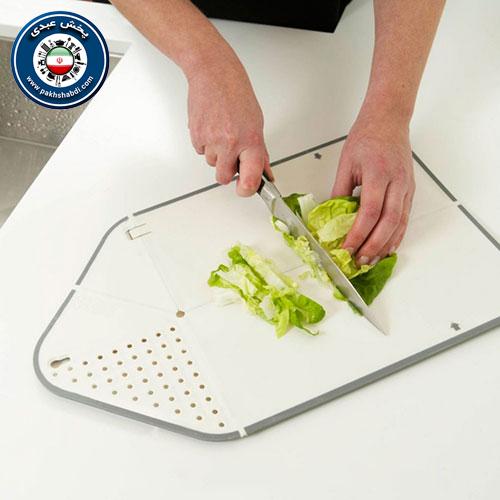 ویژگی دیگر آن تبدیل کردن آن به یک آبکش است و می توانید موادی را که خرد کرده اید روی همان بشویید و دیگر نیاز به سبد و آبکش دیگری نمی باشد. برای این کار صفحه را از وسط تا نیمه جمع کرده که حالت مثلثی می گیرد و قسمت توری شکل پایین آن را نیز جمع می کنید تا به این صفحه برسد، سپس موادی را که روی آن خرد کرده اید زیر شیر آب می شویید و آن را خم می کنید تا آب اضافی آن از قسمت پایین تخته خارج شود. این محصول کارآیی چند وسیله ی مختلف را دارد و به دلیل تاشو بودن می توانید آن را در سفرهایتان همراهتان داشته باشید و به عنوان تخته برای خرد کردن و سبد و آبکش برای شستن آنها استفاده نمایید. دارای رنگ بندی است و کیفیت بالایی دارد.